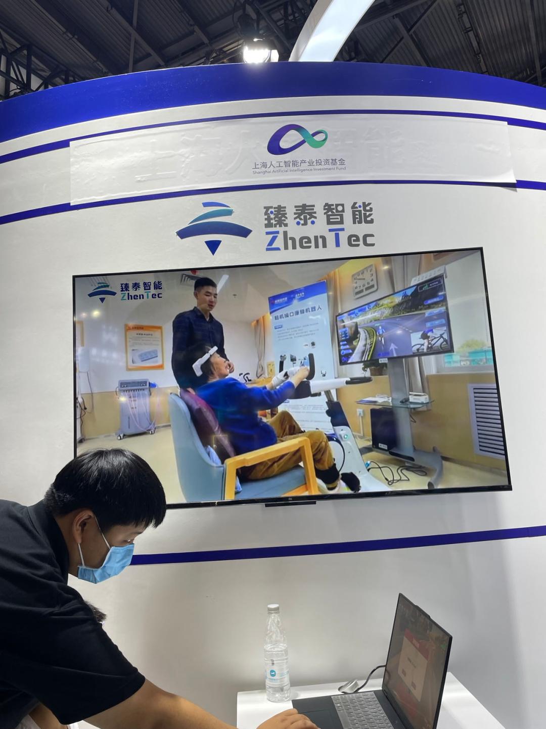 脑机接口公司臻泰科技现场展示了他们的脑机接口相关产品、训练系统。工作人员介绍称,脑机接口的产品可以用于脑卒中、脊髓损伤等疾病导致的肢体运动功能障碍患者,通过软件和硬件,帮助他们进行康复训练。