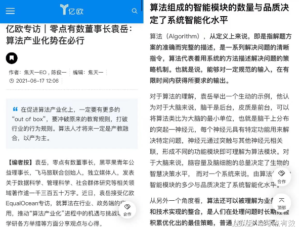 袁岳,零点有数董事长,黑苹果青年公益理事长,飞马旅联合创始人,独立媒体人,发表关于数据科学、管理科学、社会群体研究等相关领域著作逾一千三百五十万字。2021年,在世界人工智能大会之算法峰会期间,袁岳接受亿欧专访,就“算法产业化”进程中的机遇与挑战分享了洞见。本次2023世界人工智能大会期间,袁岳再次接受媒体关于算法模型的专访,阐述当下算法模型发展的产业价值,深化大模型背景下算法模型发展的新议题。