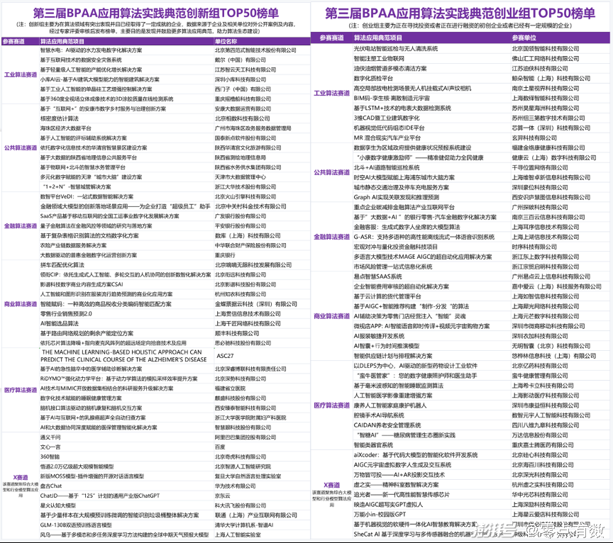 在大模型热的背景下,应用算法为中模型及行业应用大模型的发展提供了更好的运行环境和技术基础,为算法人才发展、部署和投入提供更多支持。从2020年上海世界人工智能大会上提出要重视算法产业化建设,到如今连续三年成功举办BPAA算法应用实践典范,我们每年都积累了优秀的算法模型TOP50代表,而在第三届新设置创新组和创业组,分别评选TOP50算法模型代表,迄今为止积累了200强算法团队。这些团队是中国本土算法模型的先行者,是在中、小模型已有成就的建设者,也是未来大模型建设重要的支持力量。
