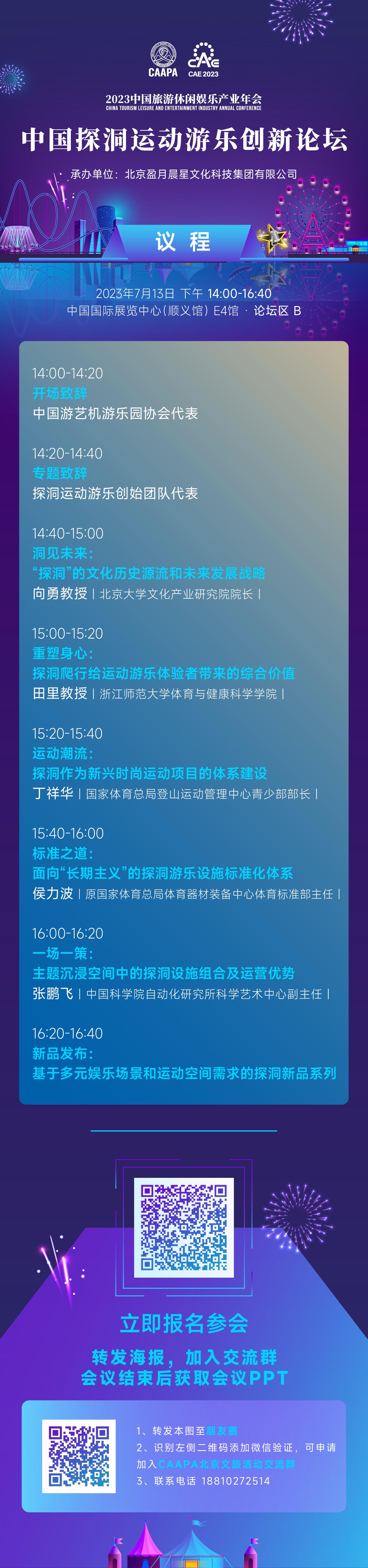 作为由中国游艺机游乐园协会(CAAPA)主办的2023中国旅游休闲娱乐产业年会分论坛之一,“中国探洞运动游乐创新论坛”将于2023年7月13日在中国国际展览中心(顺义馆)举办。届时,北京大学文化产业研究院院长向勇教授,浙江师范大学体育与健康科学学院田里教授,国家体育总局登山运动管理中心青少部部长丁祥华,原国家体育总局体育器材装备中心体育标准部主任侯力波,中国科学院自动化研究所科学艺术中心副主任张鹏飞将齐聚北京顺义,共同探讨探洞运动游乐的创新与发展。