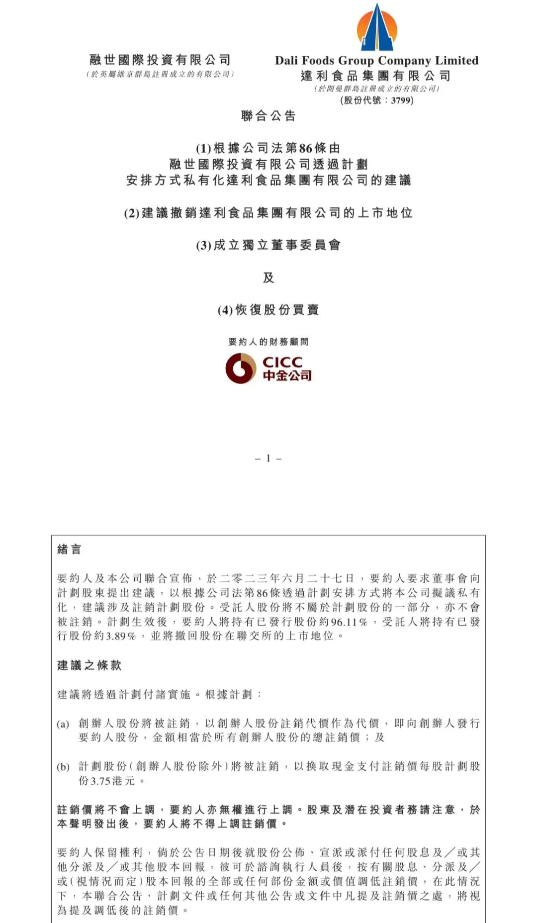 近日,达利食品与融世国际投资有限公司发布联合公告,称拟启动私有化退市。截至公告日,达利食品董事会主席、实控人许世辉的家族信托持有达利食品85%的股份,融世国际为许世辉麾下全资子公司。对于退市原因,公告中称,达利食品股价一直处在较低价格区间,成交量有限,不符合在业内地位,无法向市场传导真实价值。达利是否被低估了?