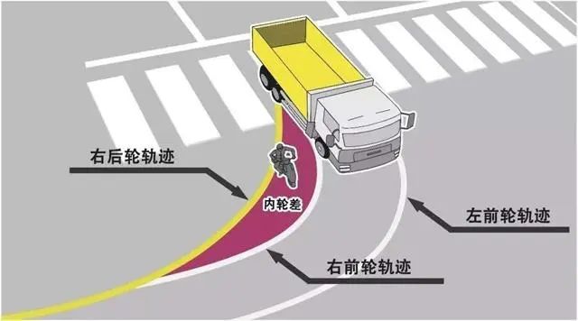 “内轮差”是指车辆在转弯时,前内轮转弯半径与后内轮的转弯半径之差。车身越长越大,内轮差越大。特别是大货车在右转弯时,由于内轮差的存在,前后轮轨迹会形成大面积盲区,因形似弯月状,也被称作“死亡弯月”。行人、非机动车在通过路口时,一旦进入“死亡弯月”区域,极易被大货车刮倒,甚至被卷入车底发生碾压事故,后果不堪设想。