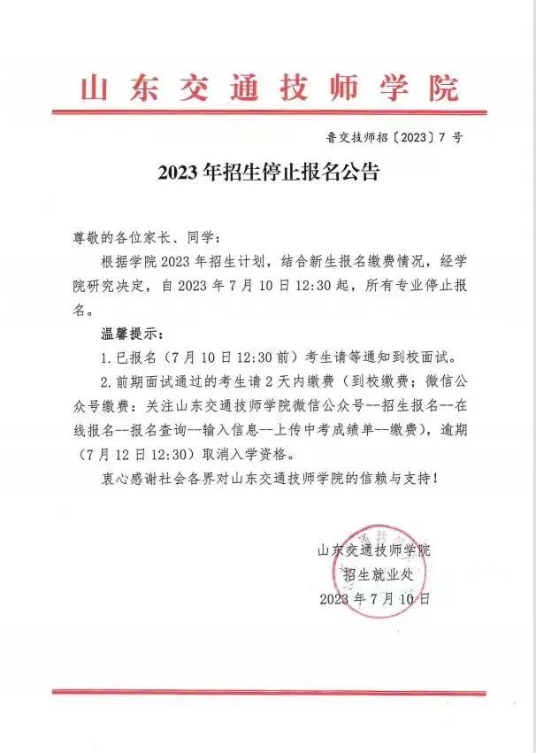7月10日12:30,山东交通技师学院所有专业停止报名,招生工作圆满完成。临沂市中考成绩公布仅6天,报名人数达11000余人,交费人数突破8000人。