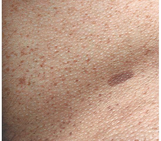 雀斑样损害(小的咖啡牛奶斑,好分布在皱褶部位,5%的病人可以全身分布)色素减退性卵圆形斑片