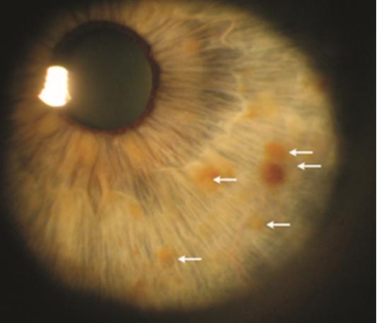 脉络膜错构瘤(4~5岁)和Lisch小结(7~8岁)