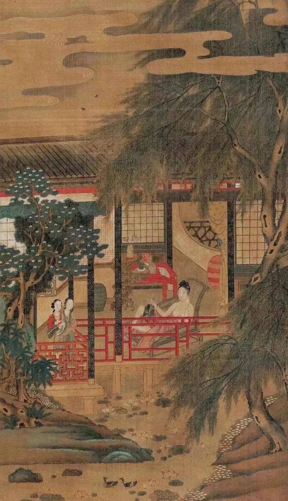 到了宋代,除了皇宫,高官显贵们纷纷建立起私家避暑的“凉屋”,不但以风轮送冷水凉气,还在蓄水池上和大厅四周摆设各种花卉,享受清凉的同时,还能欣赏美景。到了明朝,这种避暑建筑,才慢慢走向民间。《挥扇仕女图》(局部)