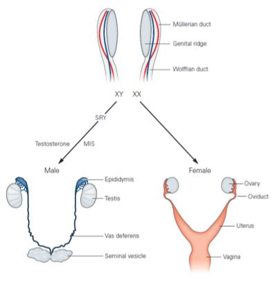 在哺乳动物中,性别分化最初是由遗传因素即SRY基因的表达与否决定,随后在性腺发育后,性别分化转变为性激素对全身细胞的影响和指导作用(图3)。