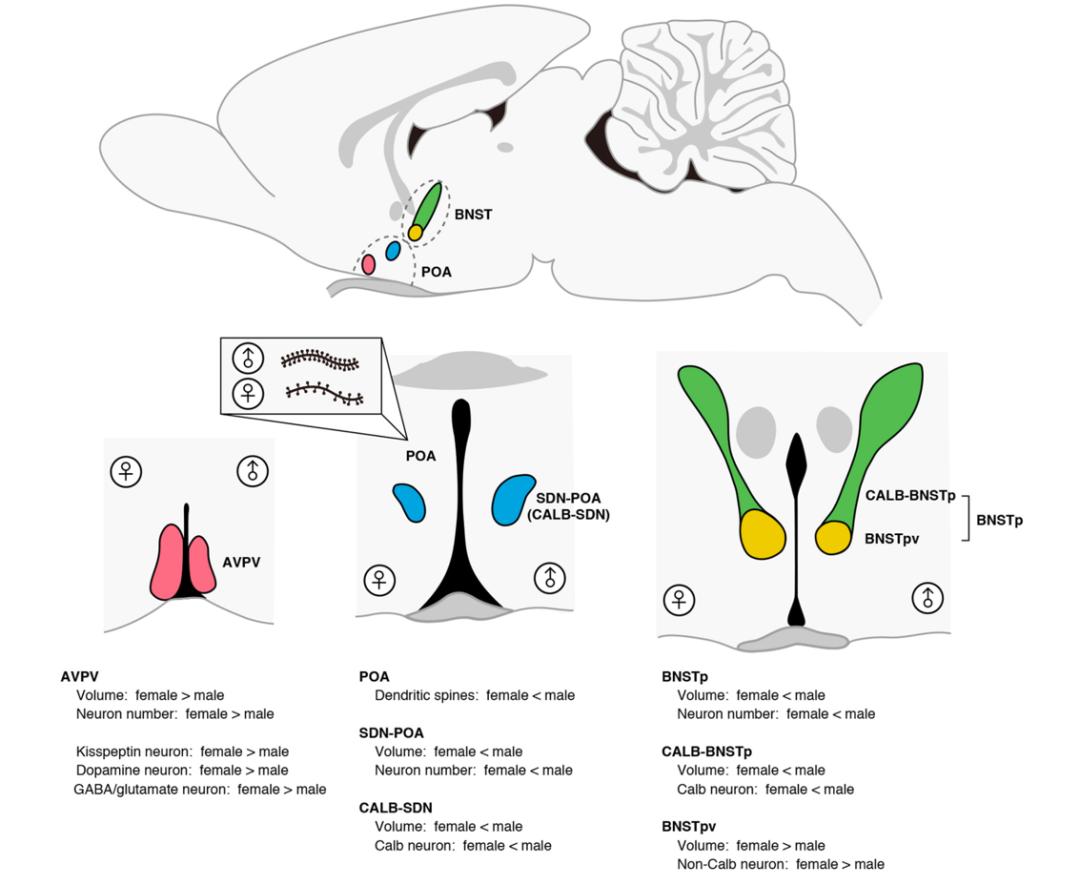 需要指出的是,在人类大脑的主要部分——皮层中,鲜有性激素受体的表达。换言之,性别并不是大脑结构的决定性因素,我们的大脑中并不存在像外周生殖器官那样非雌即雄的结构。不过,在一些特定与繁衍和激素分泌相关的皮层下脑区和核团中,存在显著的性激素受体表达和肉眼可见的性别差异,尽管这些区域相对于整个大脑来说非常小。