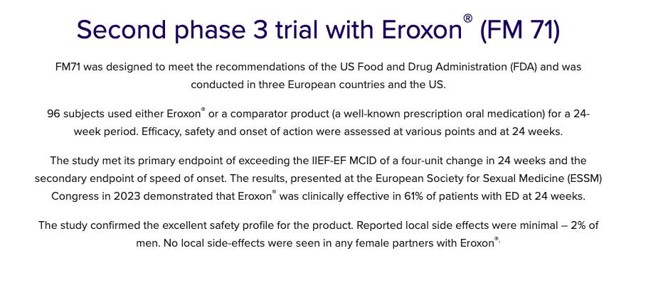 ◎ 根据FDA建议设计开展三期临床试验的数据公布。/ 官网截图这样的数据不得不说非常精彩,上市后受到大量ED患者追捧。但也有不少专家表示,对于这类涂抹式ED药物效果存在保留态度,“从成分表来看,作用机制属于纯物理反应,没有明显的药物作用。”戴继灿说道,此外FM71的证据等级并不高。
