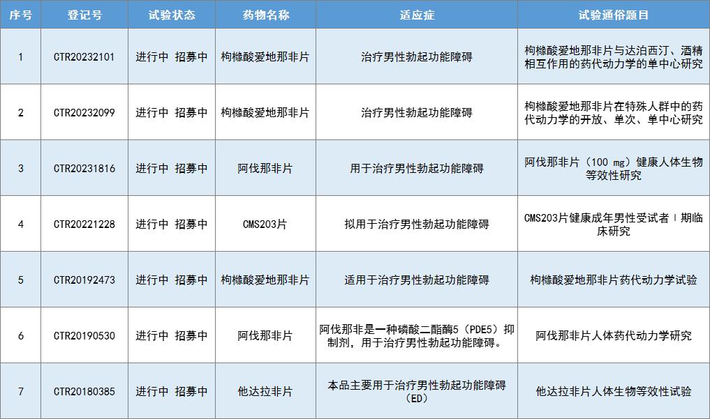 ◎ 处于临床试验或药品申报阶段中的7种PDE5抑制剂。/ 资料来源于药物临床试验登记与信息公示平台国内目前的抗ED药物市场已是一片红海。