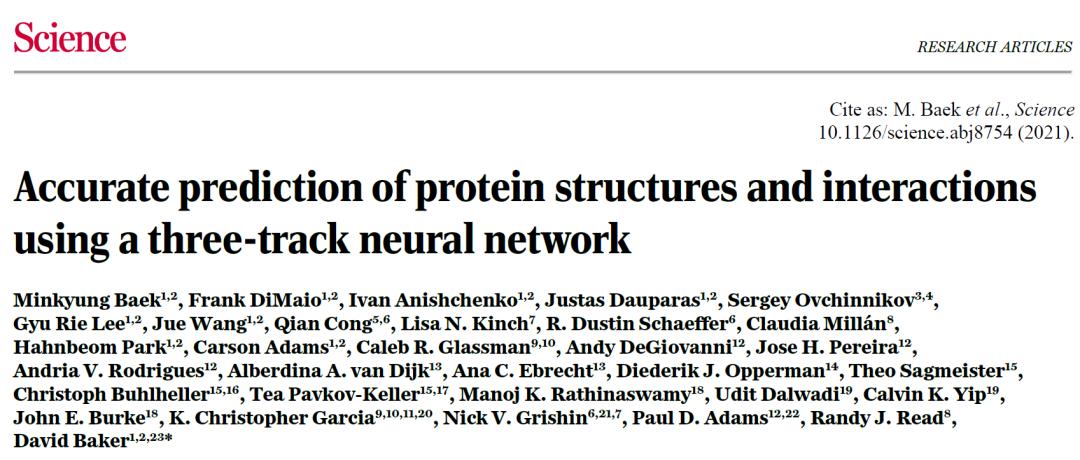 2021年7月15日,David Baker 实验室在 Science 期刊发表了题为:Accurate prediction of protein structures and interactions using a three-track neural network 的研究论文【2】。该研究开发了一种AI蛋白质结构预测系统——RoseTTAFold,其可与AlphaFold相媲美,不仅可以预测蛋白质结构,还能预测蛋白复合物结构。