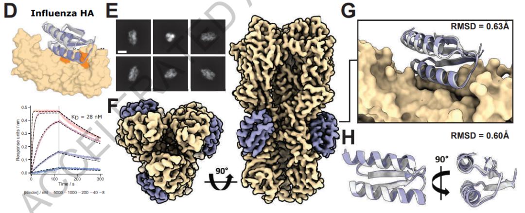 研究团队还生成了设计的一种结合蛋白与其底物(此处为流感血凝素——在流感病毒表面发现的蛋白)的复合物,并使用冷冻电镜解析了其结构,结果显示,冷冻电镜解析的结构与设计的模型几乎一模一样,从而证明了该模型的准确性。