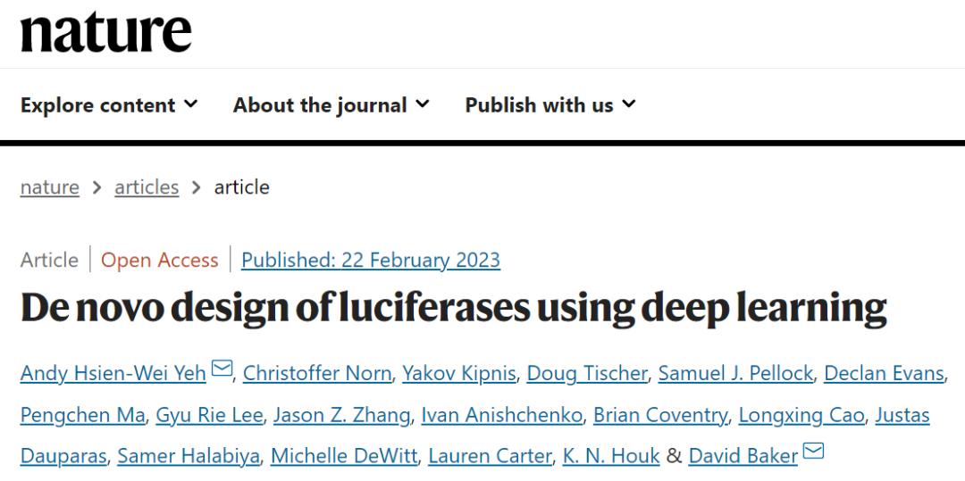 2023年2月22日,David Baker 教授团队在 Nature 期刊发表了题为:De novo design of luciferases using deep learning 的研究论文。