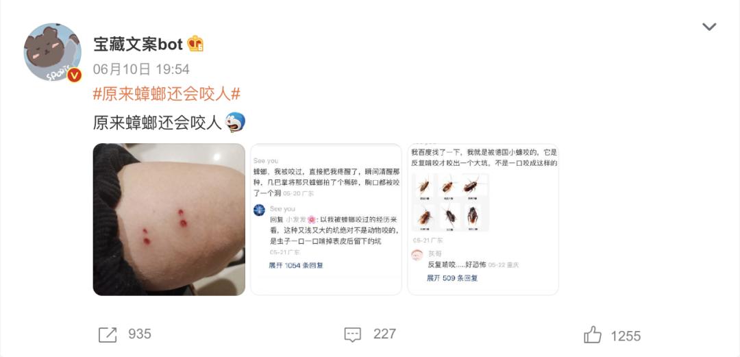 图片来源:微博截图夜里蟑螂出来咬人,是小概率事件,家里好吃的那么多,咬人的需求不大