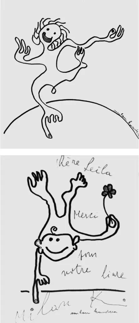 △ 出于谨慎,昆德拉更愿意给人寄送手绘图画而不是信件。他以毕加索版巴巴爸爸的方式画一些奇怪的人物,一些线条柔软圆润的形象。摩洛哥裔法国作家蕾拉·斯利玛尼家中就装裱着一幅昆德拉用儿童体签着“Milan K”的装饰画,字母i上的圆点被点缀成花蕾形状。音乐始终是他所迷恋的,同时,昆德拉还投入到写诗的热情之中。他的那位堂兄——诗人兼翻译家卢德维克又直接将他往诗歌道路上推了一把。堂兄是战时捷克一个超现实主义小组成员。这个小组中不仅有诗人,还有画家和雕塑家,全都赫赫有名。