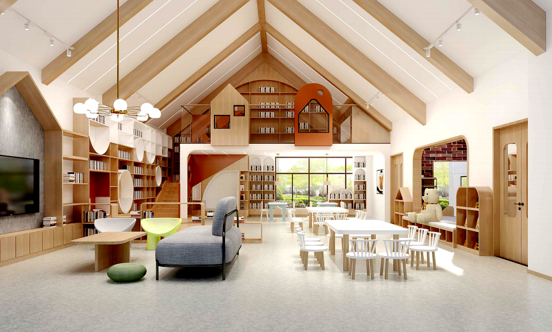 图书室分为地台阅读区、视频阅读区、趣味阅读区、集体阅读区等。