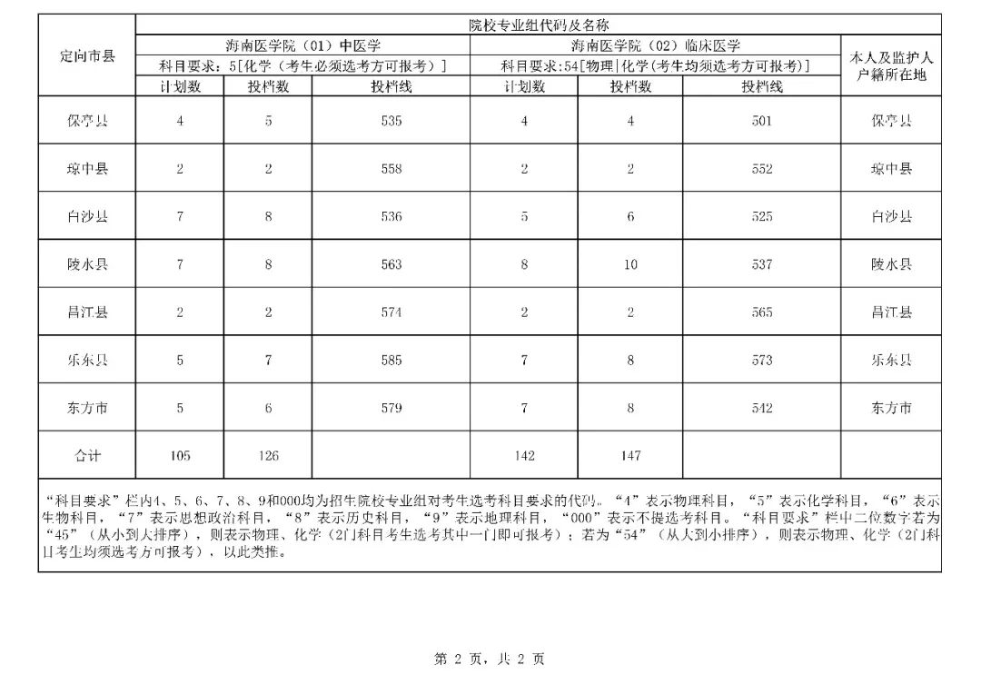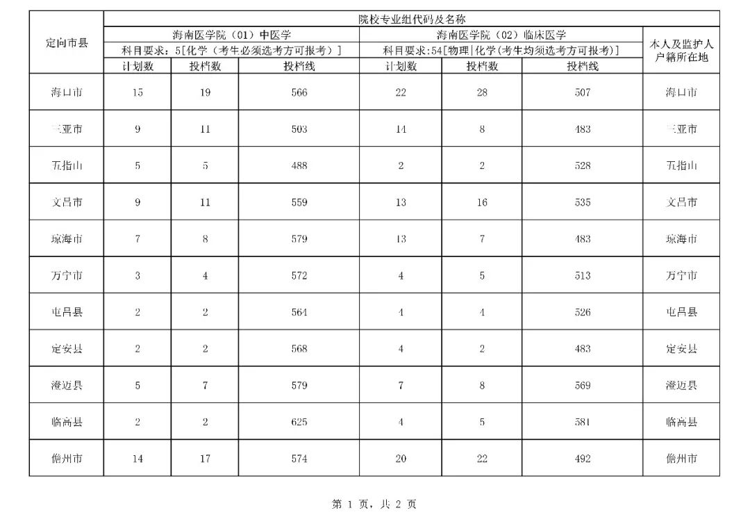 2023年海南医学院农村订单定向免费医学生培养项目人才培养计划第一志愿投档分数线