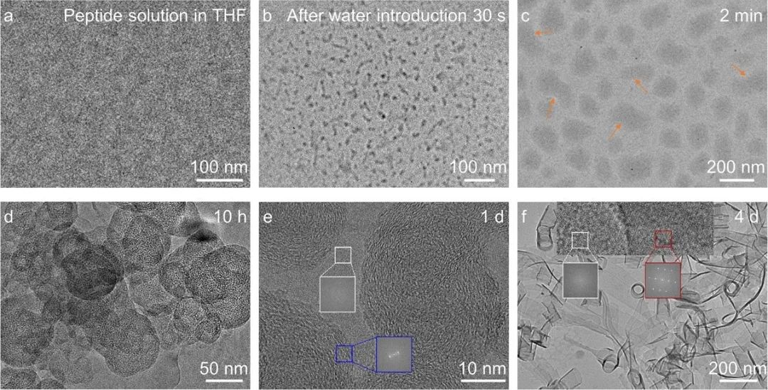 针对上述难题,中国科学院过程工程研究所闫学海研究员和袁成前副研究员等选取含有芳香环的双亲性肽为研究模型,通过溶剂交换的方法来诱导自组装的发生。利用高分辨冷冻透射电镜技术追踪了从均相肽溶液到有序肽组装体的结构演变过程(图1)。结果表明,在均相肽溶液(图1a)中引入溶剂水后,迅速形成大量无规、低密度的微小结构(图1b)。结合高分辨电喷雾电离质谱证实,上述微小结构为水和有机溶剂共同溶剂化的肽单体或者肽分子簇。这意味着,水的引入会使均相肽溶液中的溶剂化肽发生部分去溶剂化,形成部分去溶剂化的肽单体或者分子簇。其通过进一步去溶剂,诱导液-液相分离的发生,形成富含肽的液滴(图1c)。该液滴通过逐步去溶剂实现从无序到有序的结构演化,从而促进有序肽组装体的形成(图1d-f)。值得指出的是,上述多步去溶剂特征同样适用于其他肽分子和溶剂体系。因此,液-液相分离介导的肽自组装是一个多步去溶剂的过程。