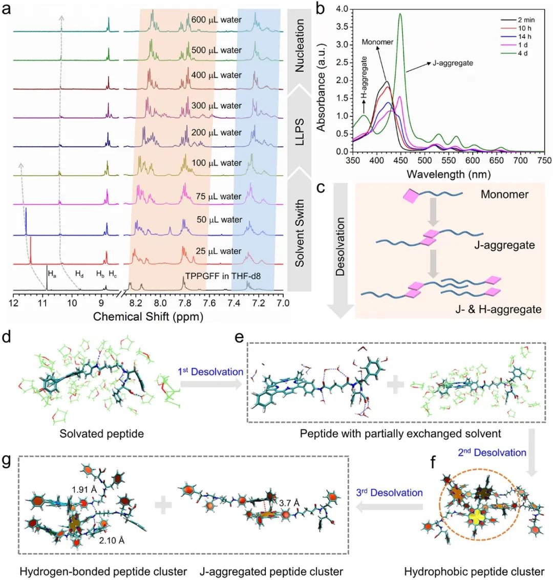图1. 液-液相分离介导肽自组装过程中的多步去溶剂现象及结构演化。接下来,作者研究了液-液相分离介导肽自组装过程中多步去溶剂的分子机制。通过核磁滴定的方式探究了肽自组装过程中与肽分子活泼氢相关的去溶剂过程(图2a),通过原位紫外光谱追踪探究了自组装过程中肽分子芳香环部分的去溶剂机制(图2b)。进一步结合密度泛函理论计算发现,在自组装的初期,与肽活泼氢相互作用的有机溶剂会被水分子取代掉,发生溶剂交换。随着水分子的进一步引入,肽分子芳香环部分的有机溶剂也会逐步失去,形成疏水分子簇,引发液-液相分离。而相分离液滴的进一步去溶剂则会诱发有序J-聚集体和H-聚集体的形成(图2c),进而促进有序核点的产生。该结果表明,去溶剂化程度与相分离液滴的形成和演化紧密相关。进一步地,作者通过分子动力学模拟深入探究了上述去溶剂过程中的微观机制(图2d-f)。结果表明,在自组装过程中,溶剂化的肽分子会通过第一步去溶剂引发溶剂交换,形成部分溶剂化的肽分子;通过第二步去溶剂,引发液-液相分离,形成富含肽的液滴;进而通过第三步去溶剂形成氢键和p-p堆积稳定的肽分子簇,促进有序核点的生成。