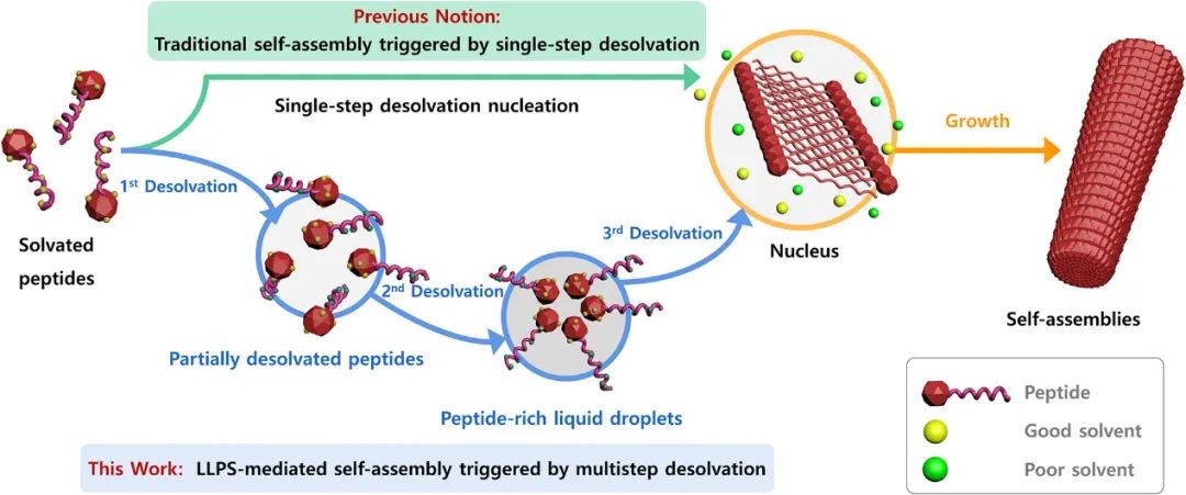 近日,中国科学院过程工程研究所闫学海研究员和袁成前副研究员等研究发现多步去溶剂机制是引发液-液相分离介导的肽自组装的关键基础。溶液中肽分子会首先发生部分去溶剂,引发肽分子簇的形成。接下来,肽分子簇的溶剂化壳层会发生选择性去溶剂,通过熵效应诱发液-液相分离的发生,形成富含肽的液滴。相分离液滴的进一步去溶剂,则会引发肽自组装成核的发生。这种多步去溶剂的特征从本质上阐述了液-液相分离介导肽自组装区别于传统单步自组装的分子机制。更为重要的是,通过对不同阶段去溶剂化程度的控制可以得到具有不同结构的组装体,为生物分子自组装的精准调控提供了基本依据。