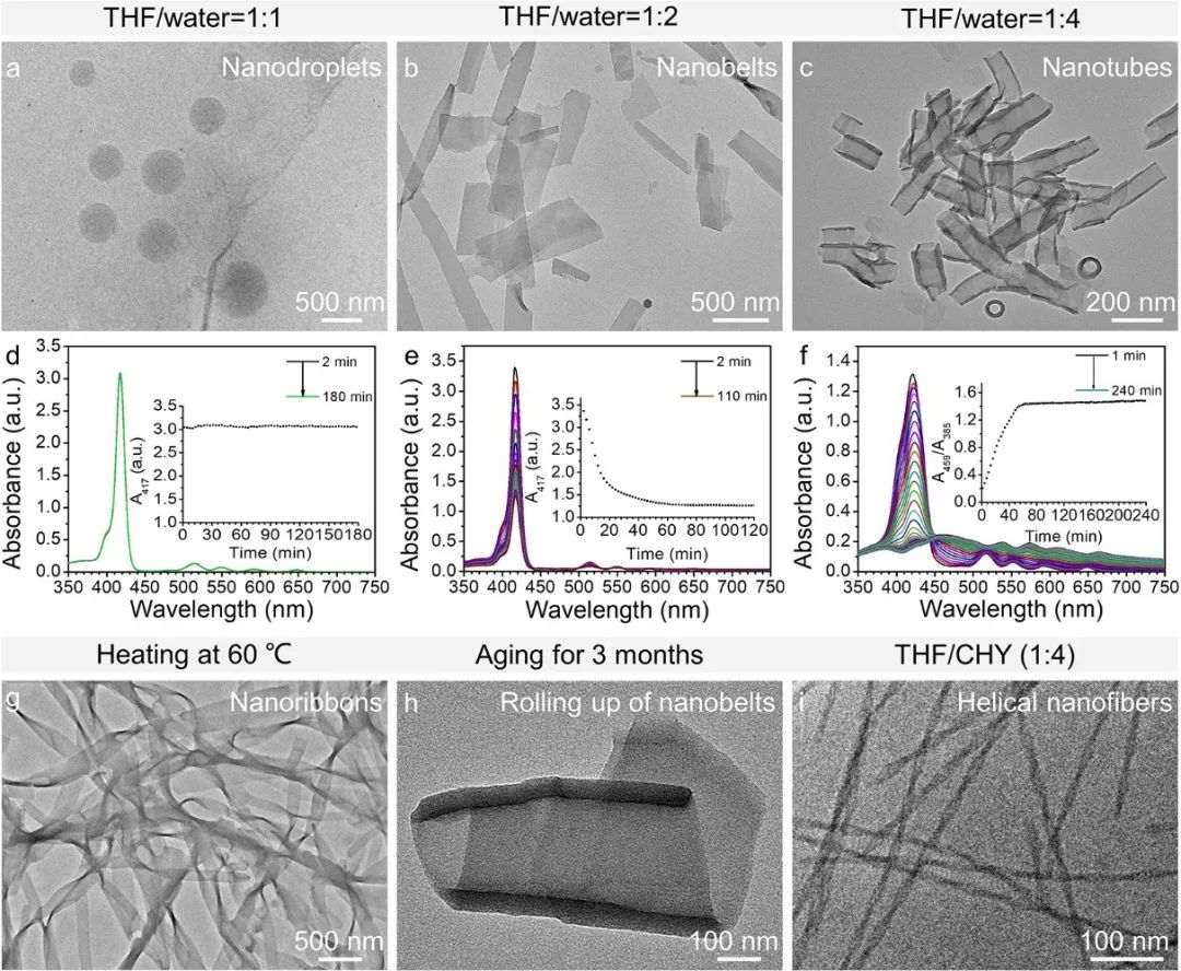 图3. 多步去溶剂引发液-液相分离介导生物分子自组装机制示意图。基于对液-液相分离介导肽自组装过程中多步去溶剂机制的认识,作者尝试了通过对去溶剂过程的操控来调控肽分子的自组装。首先,通过增加溶剂中不良溶剂水的含量来调节去溶剂动力学,可以发现,随着水的增多,组装体结构发生从纳米液滴到纳米带,进而到纳米管的转化(图4a-c)。原位紫外光谱表明,溶剂中水含量的增加有利于提高自组装速率(图4d-f)。考虑到升高温度能够降低去溶剂能垒,所以在THF/water=1:2的条件下,在组装早期阶段进行60℃、10min的加热处理,促进液滴的充分去溶剂,诱导方向性氢键的形成,最终导致柔性长纳米带的形成(图4g)。通过在室温下延长去溶剂时间,促进其卷曲形成纳米管(图4h)。而将不良溶剂水换成环己烷(THF/CYH=1:4),则会促进肽分子间氢键和p-p堆积,诱导螺旋纳米纤维的形成(图4i)。以上结果说明,通过对自组装不同阶段去溶剂化程度的有效调控可以实现对肽自组装结构的精准调控。