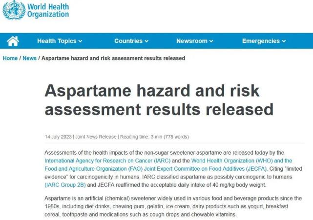 IARC引用了对人类致癌的“证据有限”,将阿斯巴甜归类为可能对人类致癌(IARC 2B组),JECFA则重申了40mg/kg体重的可接受每日摄入量。
