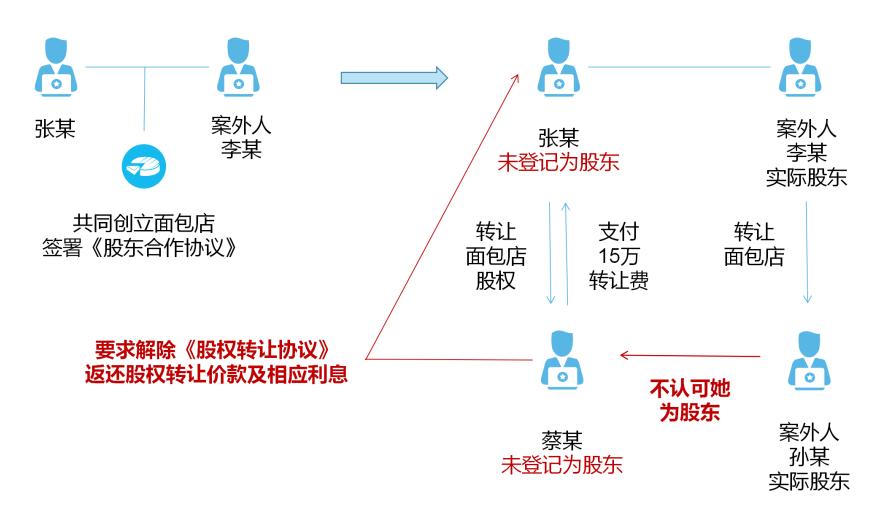 2017年12月,原告蔡某与被告张某签订了该面包店的股份转让协议,约定张某将其持有的面包店股权转让给蔡某,蔡某因此向张某支付了15万元转让款,张某退出面包店经营,张某将蔡某拉进了微信群并自己退出了群聊,但并未将蔡某变更登记为公司股东,亦未将其载入股东名册。后案外人李某未经蔡某允许,将该面包店转让给案外人孙某,孙某不认可原告蔡某系公司股东,蔡某无法再实际享有股东权益。蔡某认为,自己与张某签订的《股权转让协议》应被解除,诉至法院要求张某返还其支付股权转让价款及相应利息。