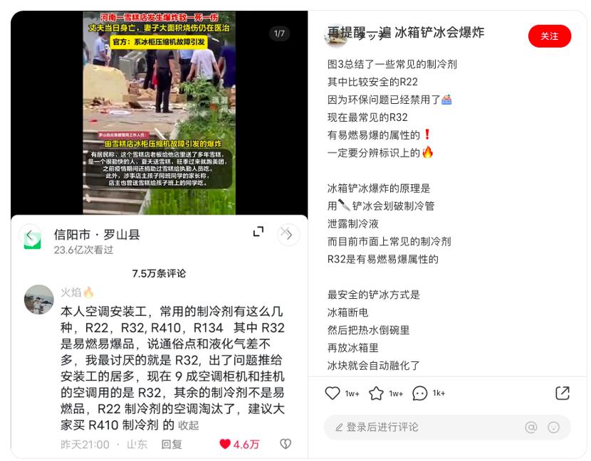 还有网友说,机体破损导致爆炸的情况,也可能在空调上发生。的确,很多空调用的制冷剂也是R32。不过空调悬挂在高处,非专业人员也很少去动它,相对来说还是比较安全的。