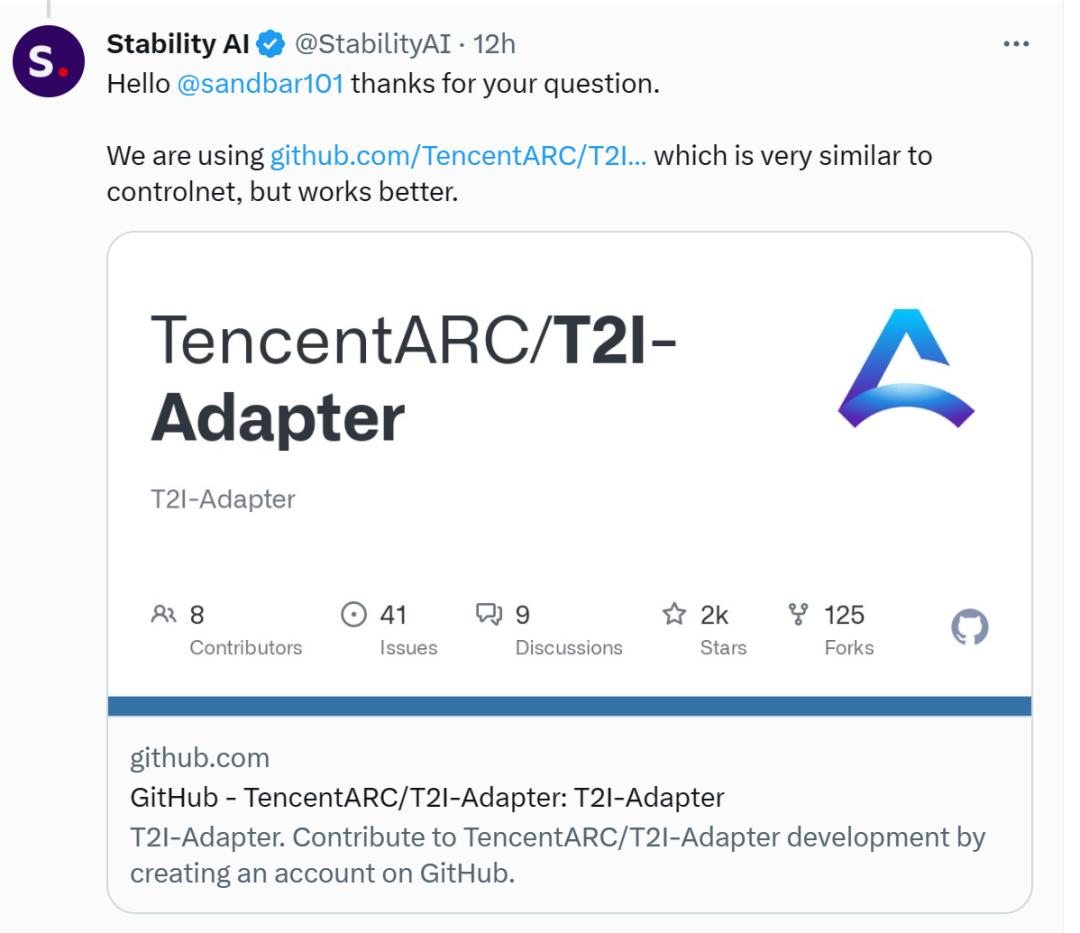 Stability AI 在推特中表示,T2I-Adapter 与 controlnet 相似,但是效果会更好。通过将可训练的参数添加到现有的大型扩散模型中,T2I-Adapter 可以包含额外的输入条件,如草图、分割图或关键姿势。该框架同时支持多个输入引导模型,增强了对生成过程的控制。对于 Stable Doodle 用例,T2I-Adapter 为预先训练的文本到图像模型 (SDXL) 提供补充指导,使其能够理解草图的轮廓,并根据提示与模型定义的轮廓相结合生成图像。