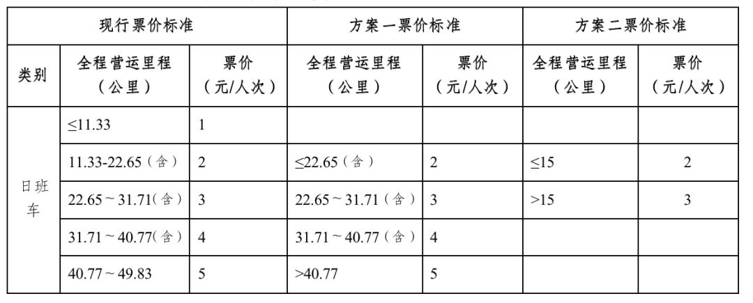 《方案》提出,针对日班车线路基础票价优化的具体方案,拟提出局部微调方案(方案一)、单一票制方案(方案二)两个方案。