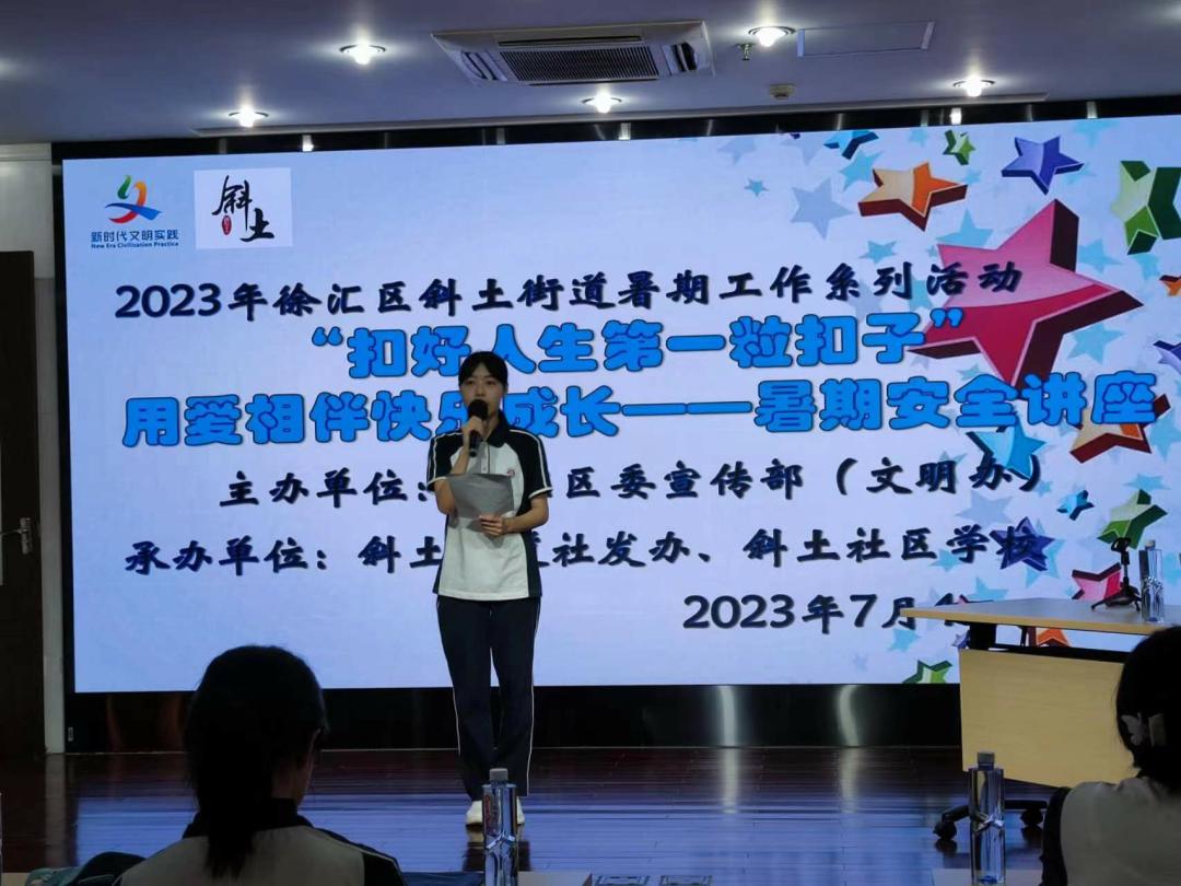 在斜土社区(老年)学校,南洋中学高一学生王靖如和同学们担任协助主讲老师,为社区儿童们宣传防溺水知识。夏季是溺水高发期,为最大限度避免意外事故发生,社区学校总会举行社区宣传讲座。“这是我第一次担任主持人,有点紧张也有点激动,这是我在校园里学习不到的技能。”活动中,王靖如担当主持人,串联起了宣传讲座的每个环节。