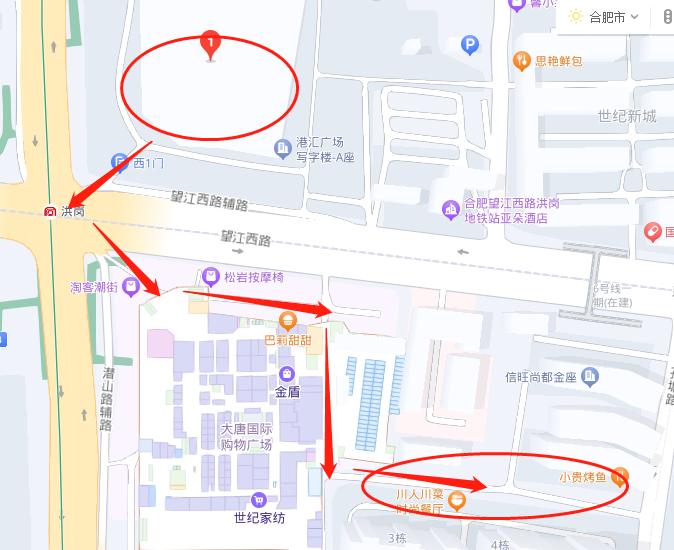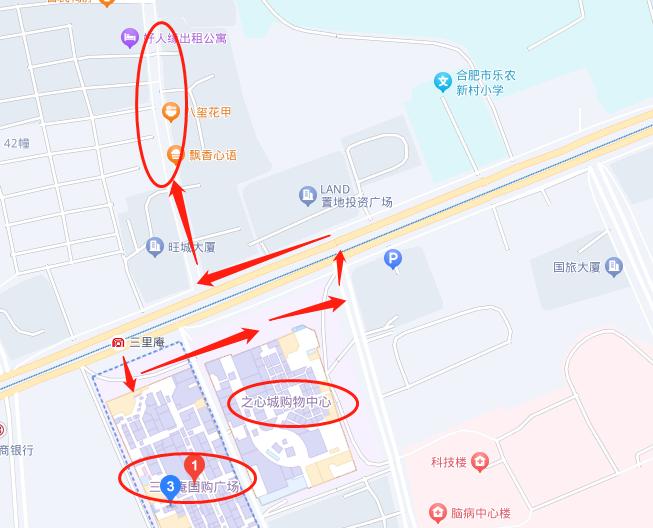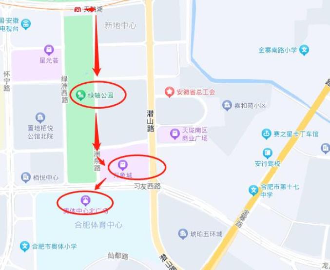 路线指引乘坐地铁4号线,至天鹅湖站,漫步于绿轴公园后,可步行至合肥万象城、合肥体育中心。
