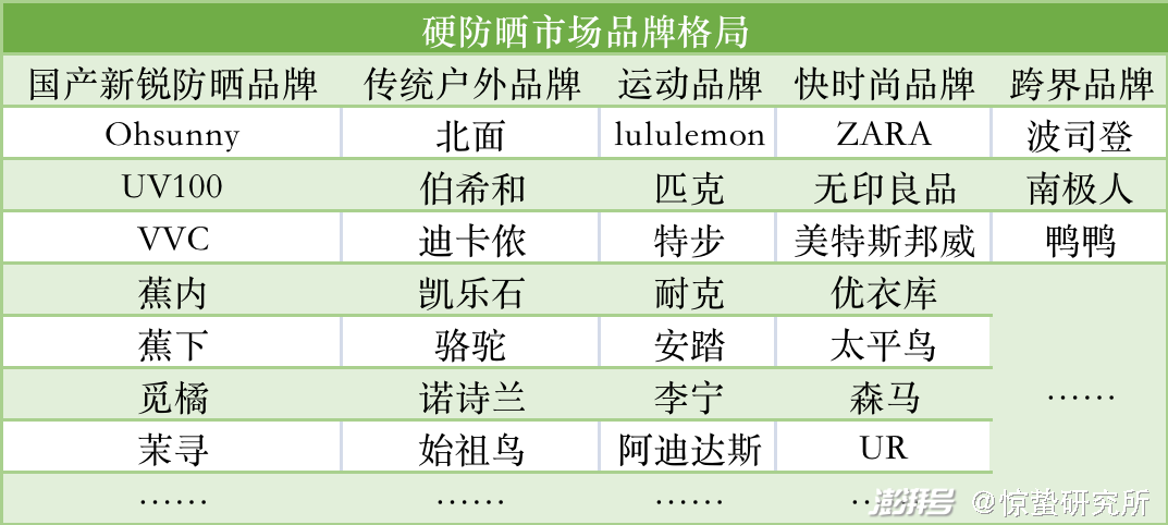 蓝海市场的快速成型,往往伴随着行业内的竞争加剧。据惊蛰研究所观察,目前硬防晒市场的主要玩家包括蕉下、Ohsunny、觅橘、茉寻为代表的新锐防晒品牌,北面、凯乐石、李宁为代表的户外/运动品牌,以及优衣库、UR等快时尚品牌。除此之外,波司登、鸭鸭等传统羽绒服品牌也加入到跨界竞争的阵营当中。而防晒衣作为硬防晒的核心单品,是众多品牌激烈搏杀的主要战场。