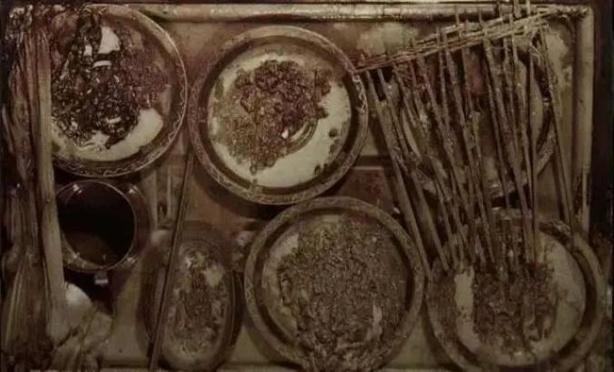 △马王堆辛追墓巨型椁室发现全套的餐具,以及菜、汤和烤肉串。西汉马王堆也发现了