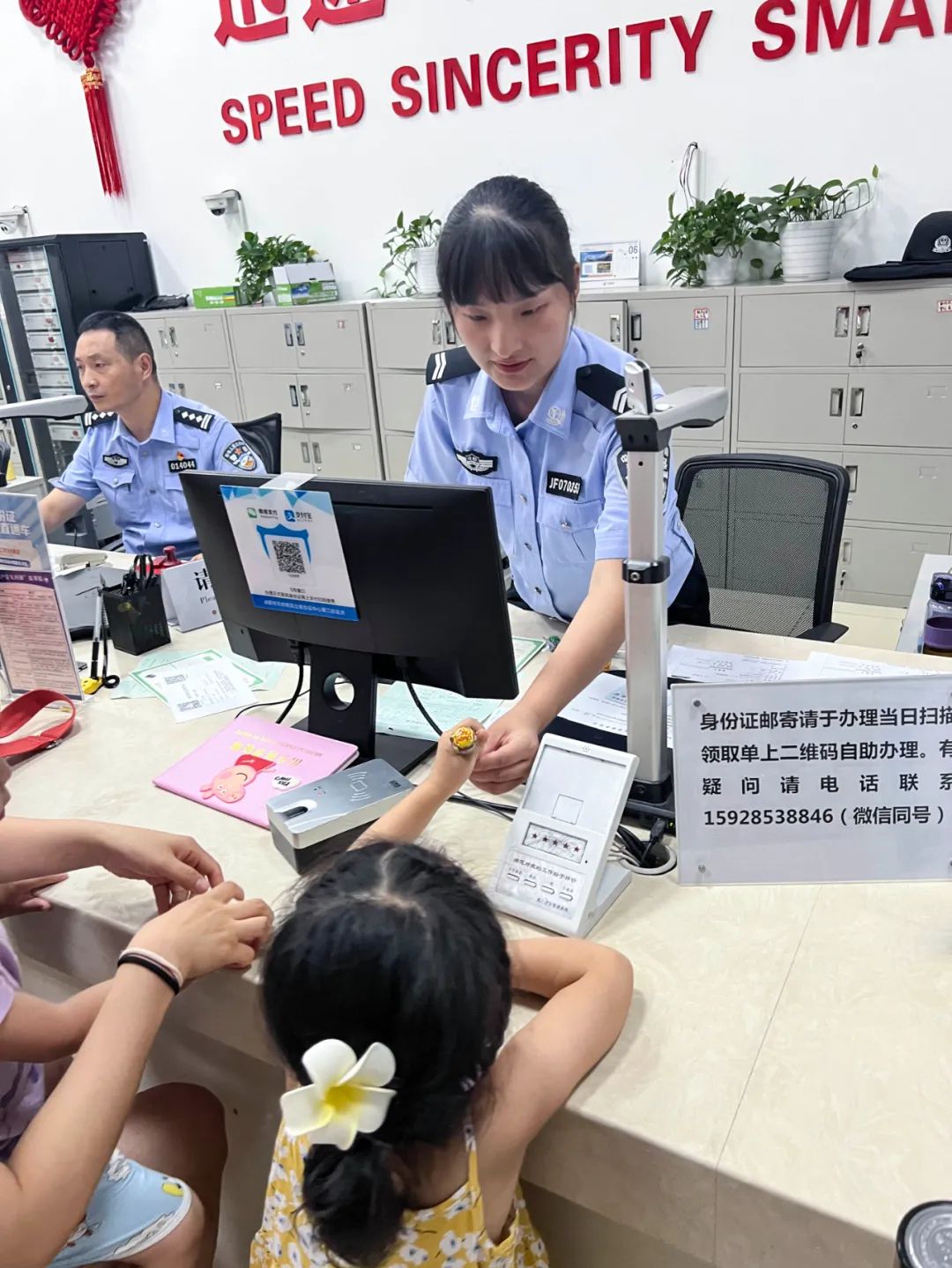 记者在场看到,彼时的办证大厅里,基本上每个孩子人手一个棒棒糖,虽然天气热,但整个氛围无比温馨欢乐。此外,在照相室里,还摆放了一些汽车、贴纸之类的小玩具,对于拍完照的幼儿,乖乖拍照完毕后,可以选择其中一个带走,而就在拍身份证照片的照相机上,还放着一个醒目的大象,每到民辅警喊:乖乖,看大象。小朋友就不由自主地把目光投向镜头,瞬间按下快门,巴适的身份证照就出炉了。