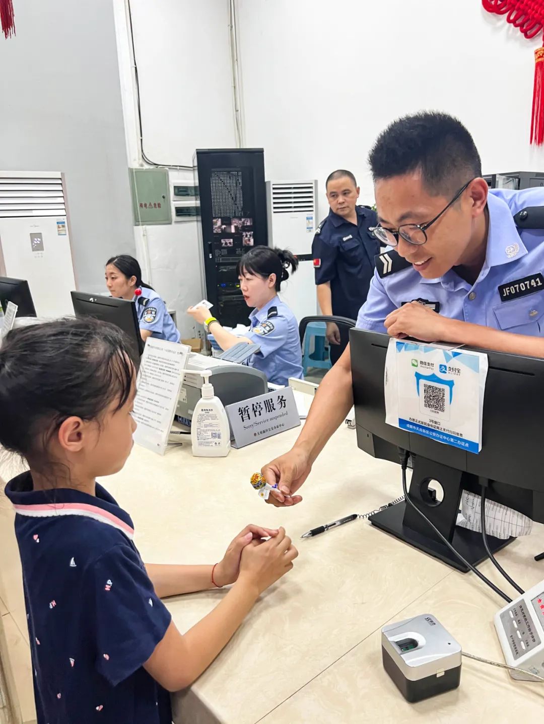 办证的娃儿多,大多又是幼儿,拍照的、按指纹的、等待的,哭的笑的还有闹的,热闹极了,为了让孩子们能够耐心、开心地等待办证,天府新区公安分局在保证万无一失、加快办证速度的同时,又搞花样了——近日,一些棒棒糖分放在照相室和办证窗口,对每个拍完照、办完证的乖娃儿,窗口民辅警都会发送一根棒棒糖,“乖乖,谢谢你的配合哦。”每个娃儿接过棒棒糖,笑眯了。