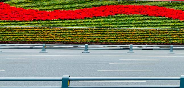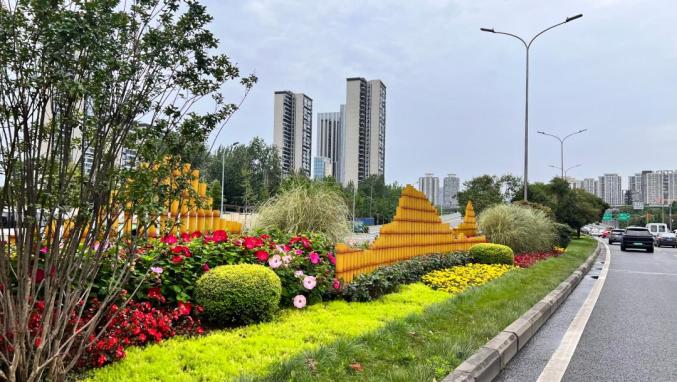 一环路地栽绿化通过提取成都大运会会徽颜色,营造植物景观;