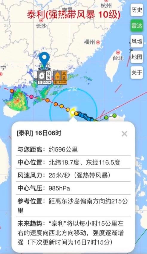 今天(16日)上午11时,今年第4号台风“泰利”(强热带风暴级)中心位于北纬19点0度,东经115点7度,也就是在距离广东省湛江市东偏南方向约610公里的南海东北部海面上,中心附近最大风力10级,达到25米每秒的风速,中心最低气压985百帕,六级大风半径约380公里。预计,台风“泰利”将以每小时15公里左右的速度向西偏北方向移动,趋向粤西到海南东部沿海,强度继续增强,最强可达台风级或强台风级(12到14级),较大可能于17日傍晚到18日早晨在上述沿海地区登陆。