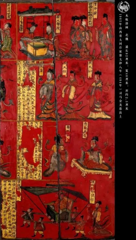 北魏延兴四年(474年)十一月二十七日,陇西王源贺的爱女钦文姬辰去世。10年之后,太和八年(484年)十一月十六日,钦文姬辰的丈夫司马金龙离开人间。墓穴打开,二人合葬,除了大批随葬物品之外,一件色彩鲜艳的木版漆画屏风被安置在墓室后室靠近甬道的地方,与夫妇二人的墓志相望。