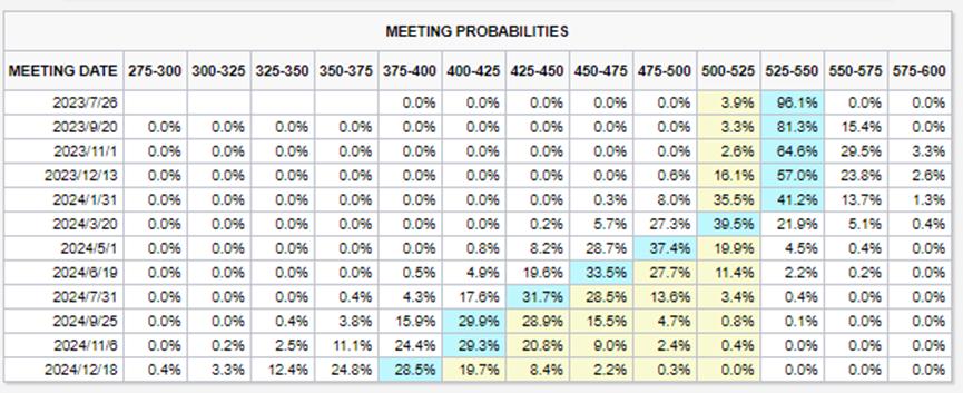 在此背景下,市场认为未来美联储继续加息的动力不足,或提前结束加息进程,据CME美联储利率观察工具显示,现在市场开始交易美联储在7月加息25个基点后将停止加息的预期(此前市场预期美联储将在7月和9月分别加息25个基点)。
