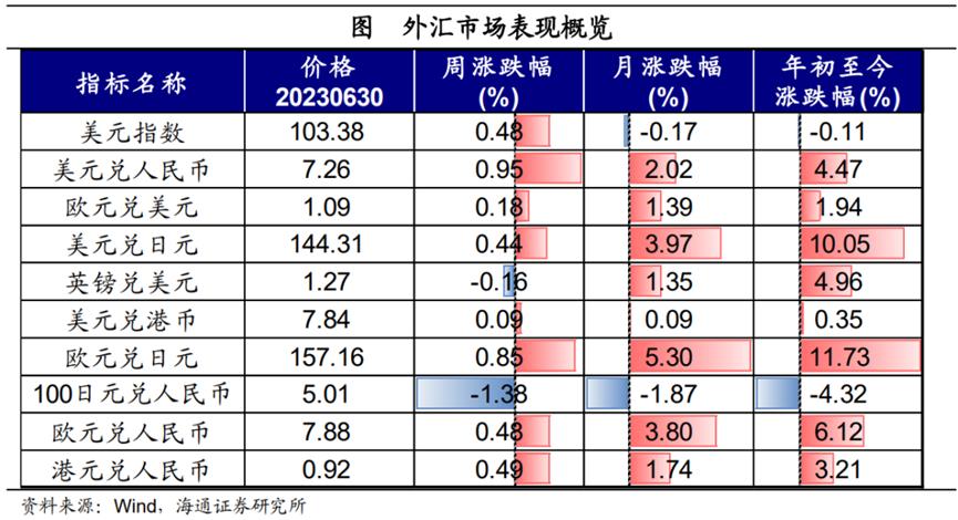 在我们此前发布的多篇文章中也有反复强调,如今看待美国CPI数据,同比已经不是最关键项,因为在去年的高基数下,今年美国CPI同比增速下降已成定局,环比增速的变化更具有指导意义。其次,此前美元汇率被相对高估,为本轮下跌留下了空间。可以看到,截至6月30日,美元指数依旧维持在103-104的位置水平,美元兑除欧元外其他货币汇率均出现了较明显的升值,但今年美国的经济基本面相对于其他国家而言并未出现根本性的好转,更多是市场对于未来美国经济“软着陆”的预期导致。