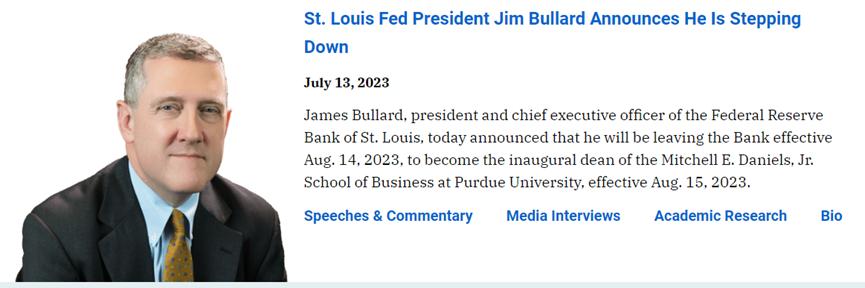 7月13日,美国圣路易斯联储在官网宣布,詹姆斯·布拉德(James Bullard)已经辞去了该地区联储主席和首席执行官的职务。