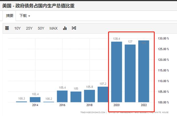 除上述问题外,日益严重的债务问题也对美元信用形成了压力。据Trading数据,随着疫情后美国加大支出,公共债务占国内生产总值的比例已从2019年的107.2%大幅上升至当前的129%。这意味着美国已经对世界其他国家产生了巨大的净负债,至少在理论上,如果外国投资者抛售美元资产,其货币很容易遭受抛售。