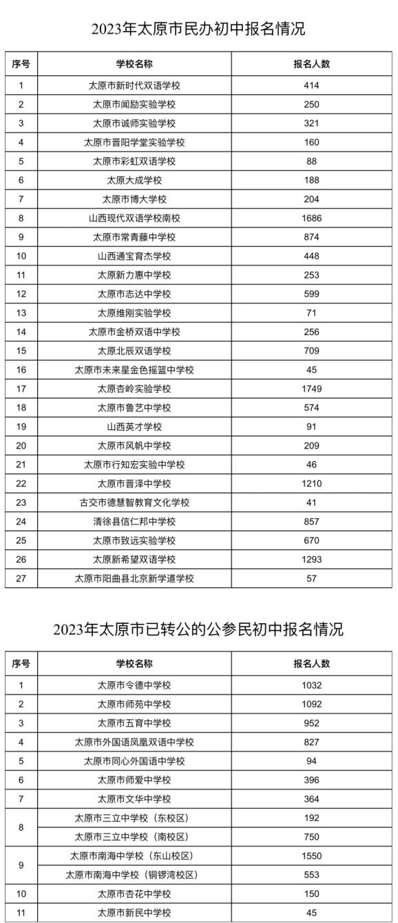 截至7月14日18:00,2023年太原市民办初中报名工作已全部结束,现对全市民办初中(含已转公的公参民学校)报名情况进行公布。
