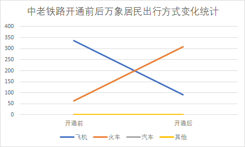 中老铁路修通之前,老挝全国的铁路总里程只有3.5公里,很多人并无乘坐火车出行的经验,中老铁路开通后,万象居民选择通过火车出行的人数大大增加。数据显示,中老铁路开通前选择乘坐飞机和火车出行来到中国的比例分别为84%和16%,而中老铁路开通后,有77%的调研样本选择乘坐火车来到中国,提高了61%。很多体验过中老铁路的老挝乘客为其舒适程度和快速便捷感到惊叹,相信随着越来越多老挝民众乘坐中老铁路并口口相传其良好体验后,选择火车出行的比例还会有所上升。