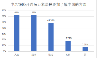 中老铁路开通后,有21.75%的调研样本表示对中国非常了解,另有44.25%的调研样本表示有基本了解,还有10.75%的调研样本表示很想了解中国。进一步调研发现,万象民众对中国的了解集中于经济和人文,两项占比均为62%,对中国政治的了解度也很高,高达48.5%,充分说明了“中老铁路”项目真实有效地增进了两国民众的相互了解和文化交流,这是中老铁路项目的扩展收益和无形效益,这些了解与沟通势必有利于两国的对话和理解,助力于两国的“政策沟通”和“民心相通”。