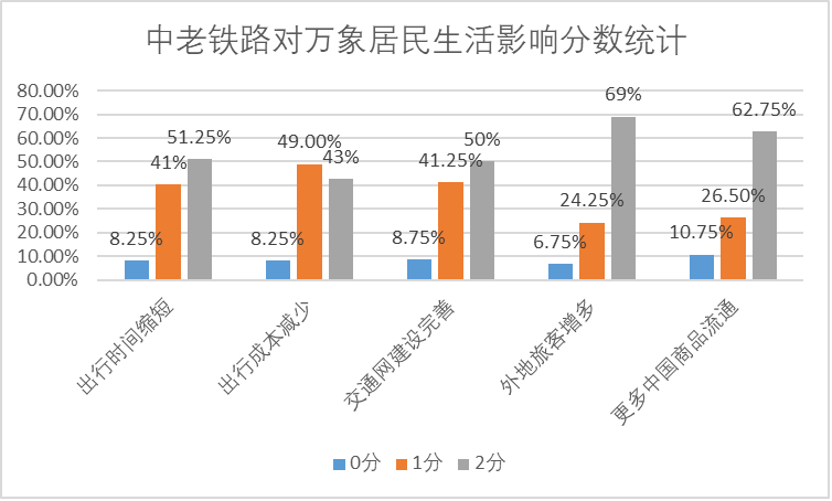 中老铁路开通后,调研样本中有51.25%的比例认为中老铁路大大缩短了出行时间,50%的比例认为公路等城市交通网建设有较大完善,69%的比例认为城内外地旅客量有大幅增加,认为市场上有更多老挝商品流通的占比62.75%,认为出行成本大幅减少的占比也达到了42.75%。其中,旅客和商品流通方面平均分超过1.5,其余三项平均分也超过1.3,说明中老铁路开通的影响已经显现在万象民众生活的诸多方面,万象民众对中老铁路有较高的认同度,对其给生活带来的变化是持正面评价的。