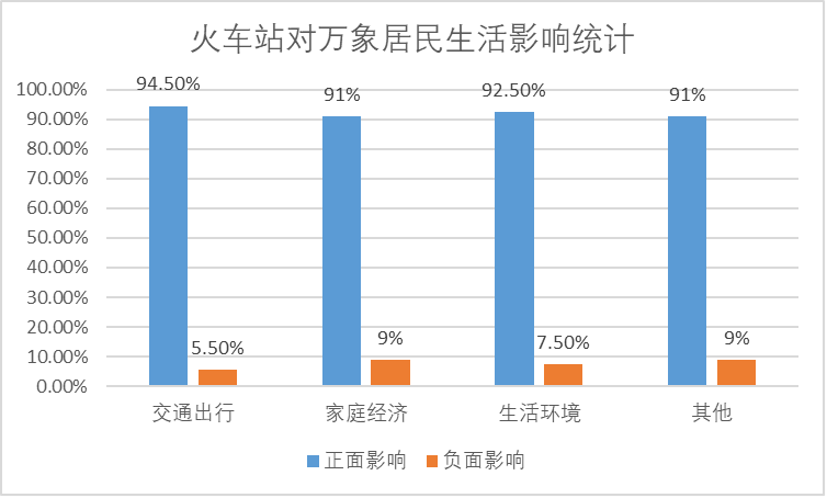 关于修建万象火车站对居民生活的影响,老挝民众与中国民众的作答情况高度一致。有94.5%的比例认为火车站的修建在交通出行方面为其带来了正面影响,91%的比例认为其为家庭经济带来了正面影响,92.5%的比例认为生活环境得到了提升,91%的比例提供了火车站修建的其他积极方面,例如带来全新的感受、每次经过火车站都令人感到有活力等。
