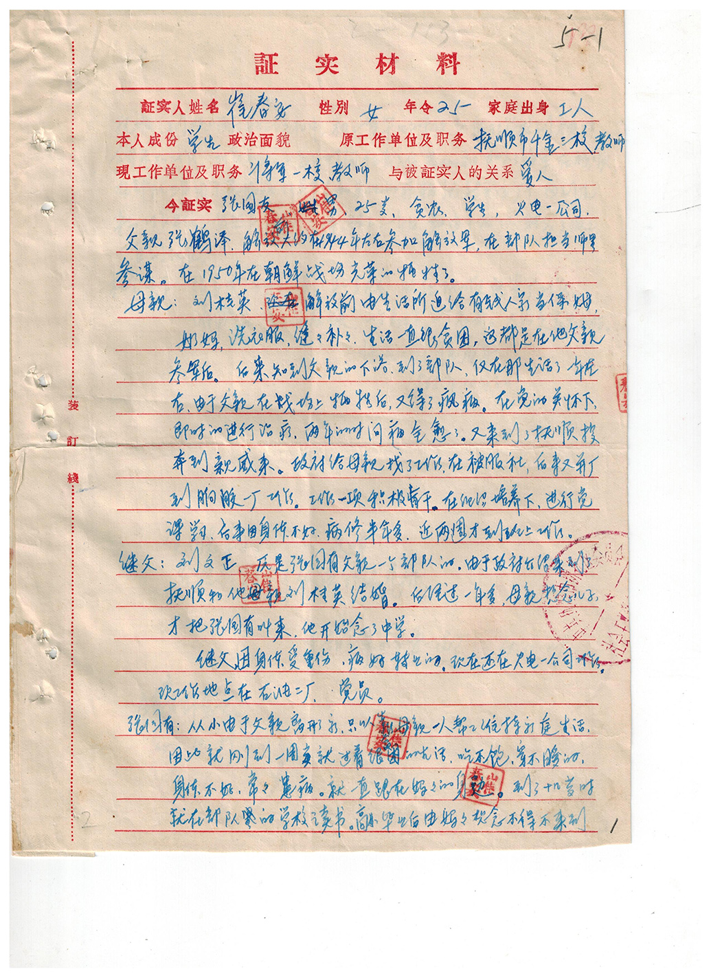 另一份是资料是崔春安写于1965年10月6日的证实材料,那年她25岁。在这则材料里,留着她当年的蓝色钢笔字迹:“父亲张鹤泽,解放前大约在1944年左右参加解放军,在部队担任师参谋。在1950年在朝鲜战场光荣地牺牲了。”