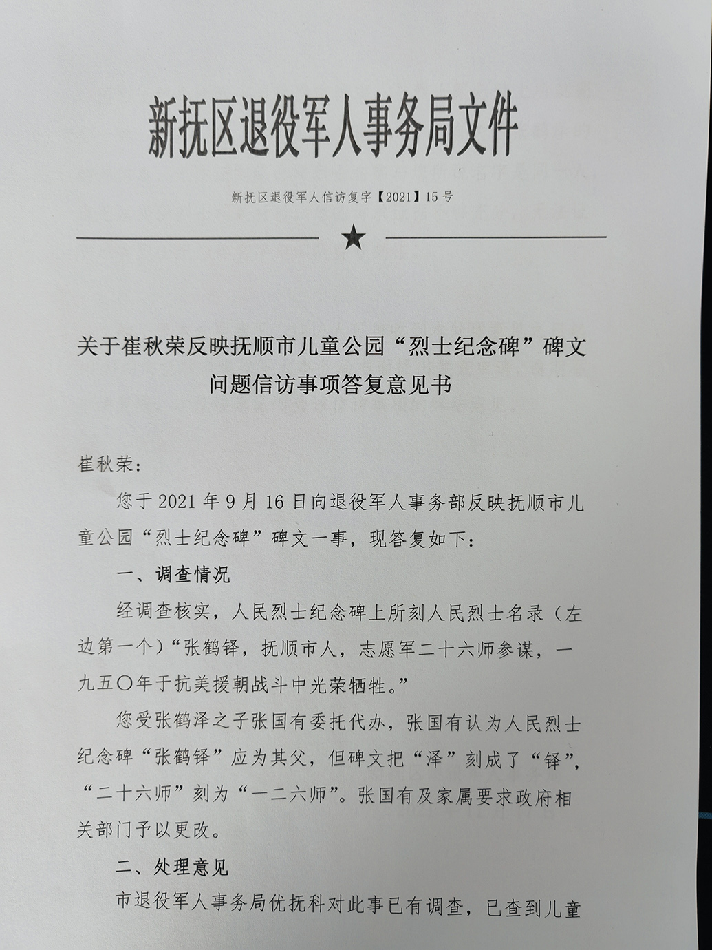 崔秋荣2月28日收到的新抚区退役军人事务局给她的答复
